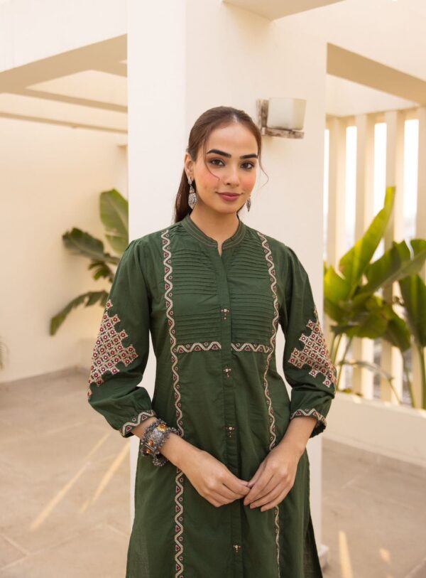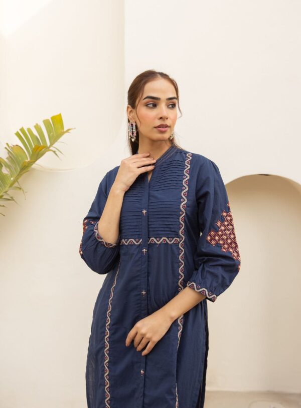 Designed with intricate pintex detailing and subtle embroidery work, this set offers a clean, structured look while maintaining breathable comfort. The premium cotton fabric ensures a soft feel against the skin, making it ideal for brunch outings, office wear, festive day events, and refined casual styling.