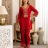 Crafted for refined festive styling, this embroidered co-ord set blends elegance with effortless structure. The kurta features intricate embroidery detailing along the neckline and sleeves, creating a rich yet balanced festive look.