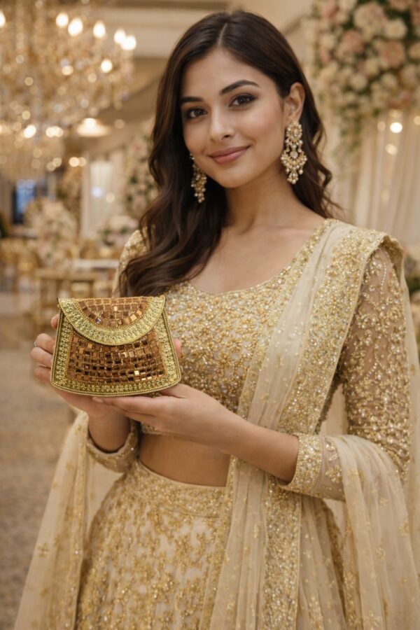 Compact yet stylish, it is perfect for carrying essentials while complementing lehengas, sarees, and festive suits. Ideal for bridesmaids, wedding guests, and festive styling.