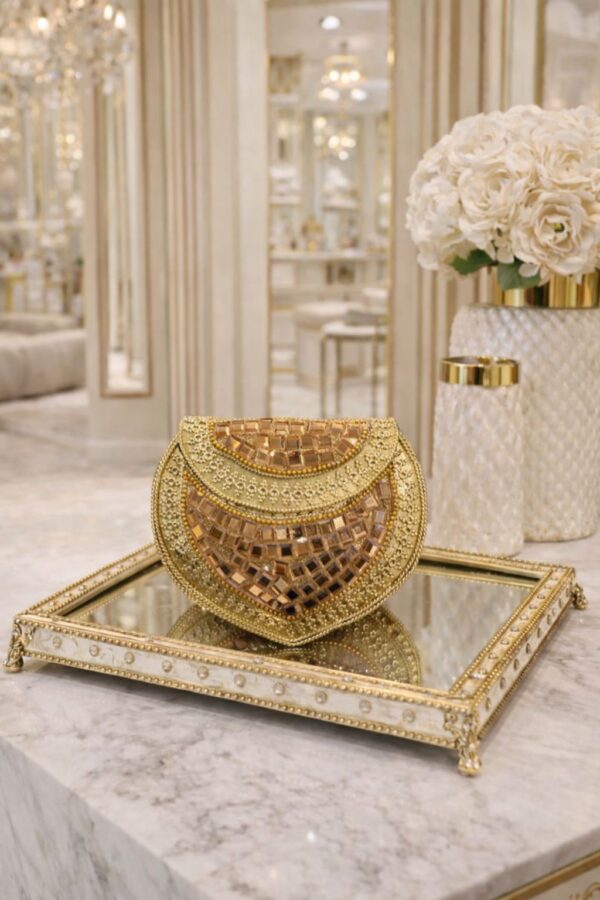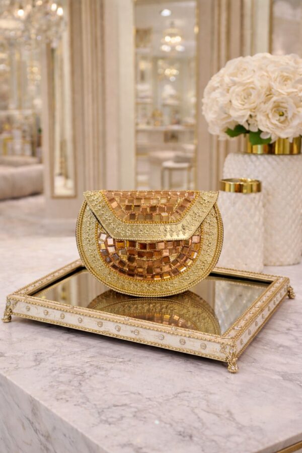Elegant sheesh kundan mini bag featuring detailed mirror and kundan work. Perfect wedding and festive accessory with free shipping across India.